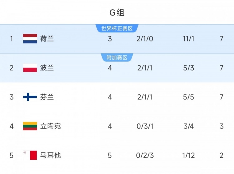 目前荷兰队在G组中2胜1平积7分,在少赛一轮的情况下暂列小组榜首。